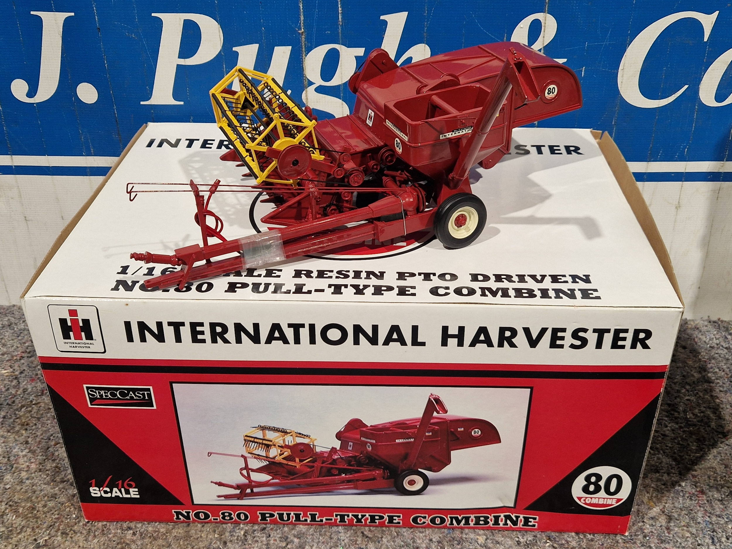 Speccast Models 1:16 scale International harvester No.80 trailer combine model. Stored in display cabinet. In good condition with original box and packaging