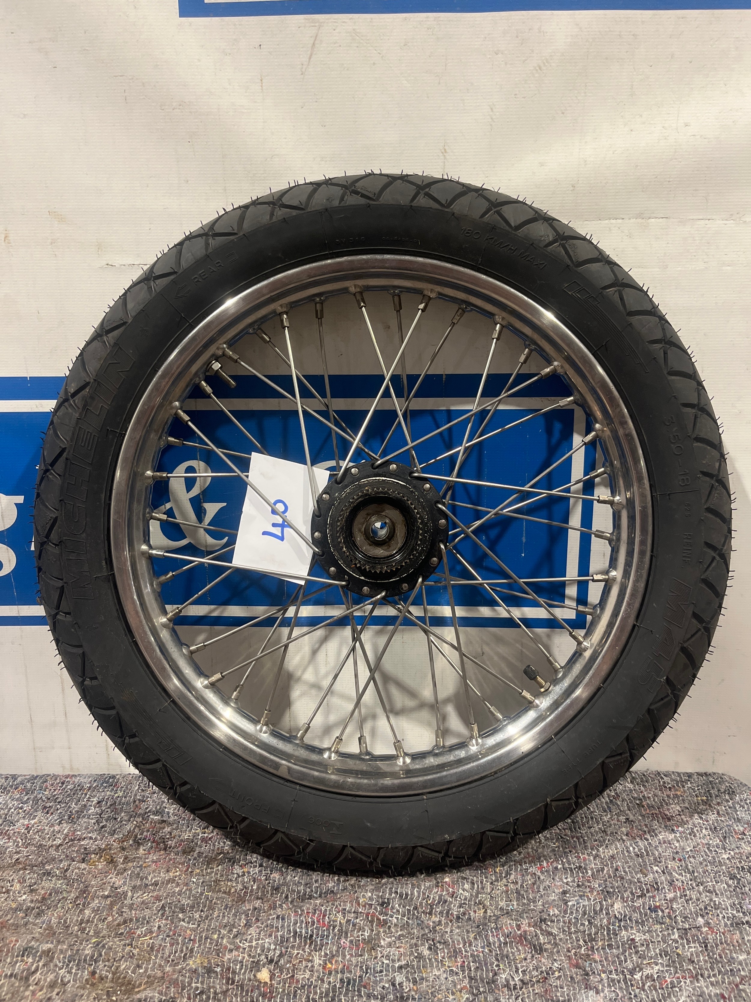 Triumph/BSA 250/350/500 rebuilt rear QD wheel with stainless rim and spokes and new Michelin tyre