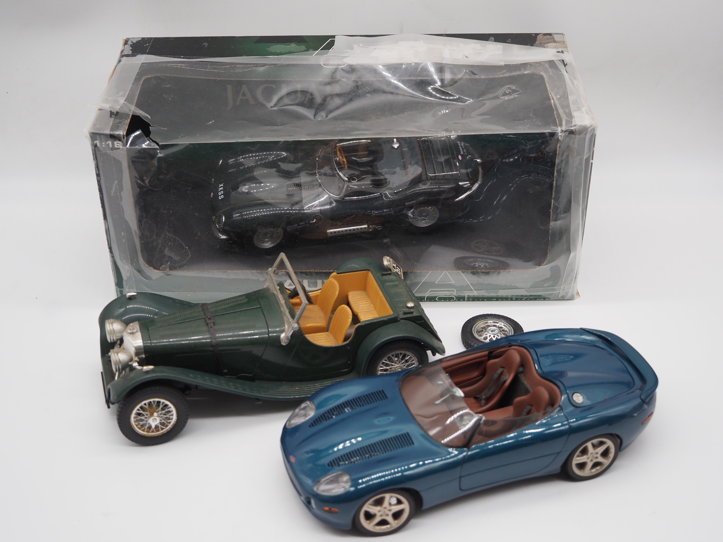 Jaguar XKSS 1/18th scale Autocart model in original box, Jaguar XK180 and SS100 models both 1/18th scale